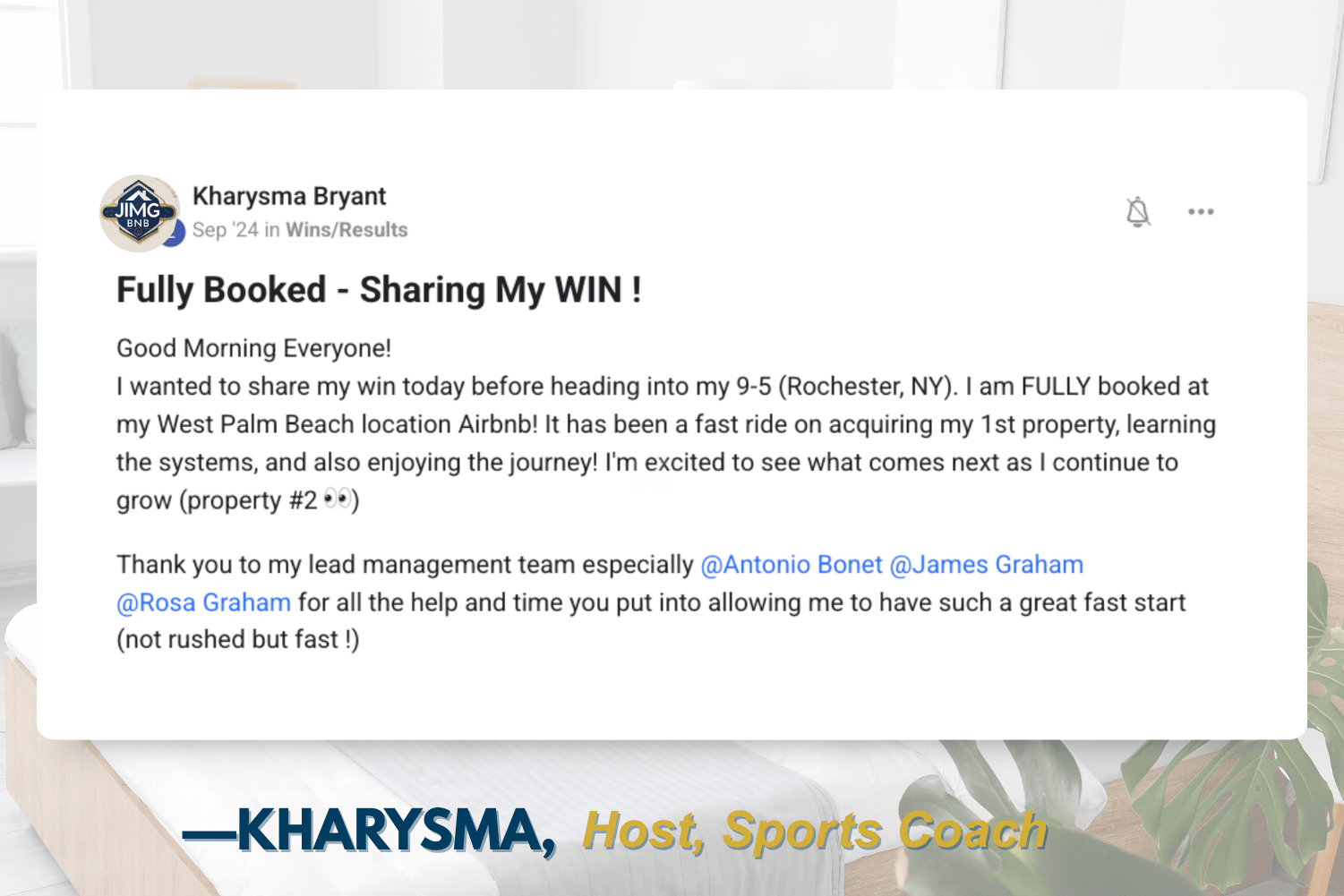 For underperforming or burned-out hosts who feel stuck — or for newbies who want to get started but don’t have a property (yet) or don’t know where to begin. We’ll walk alongside you, equipping you with the tools, systems, and support to turn your hosting journey into a thriving business.